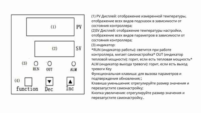 После нажатия кнопки в течение 5 секунд мигает индикатор RUN, прибор начинает самонастройку, самонастройка завершается, индикатор RUN перестает мигать, получают новый параметр ПИД, который может преодолеть перегрев, прибор продолжает управление в соответствии с новым параметром ПИД. Новый параметр ПИД можно проверить в приборе.