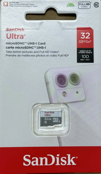 SanDisk Ultra MicroSDHC 32 ГБ 100Mb/s Class 10 UHS-I — карта памяти формата microSDHC объёмом 32 ГБ, класс скорости 10 и UHS-I U1, скорость чтения до 100 МБ/с, запись около 10 МБ/с. Подходит для видеорегистраторов, камер, смартфонов и других устройств с поддержкой microSDHC, оптимальна для записи Full HD видео.