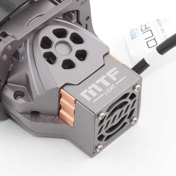 Компактная гибридная система охлаждения, состоящая из медного радиатора с обдувом двумя вентиляторами охлаждает светодиоды до рабочей температуры даже при высоких температурах окружающей среды.