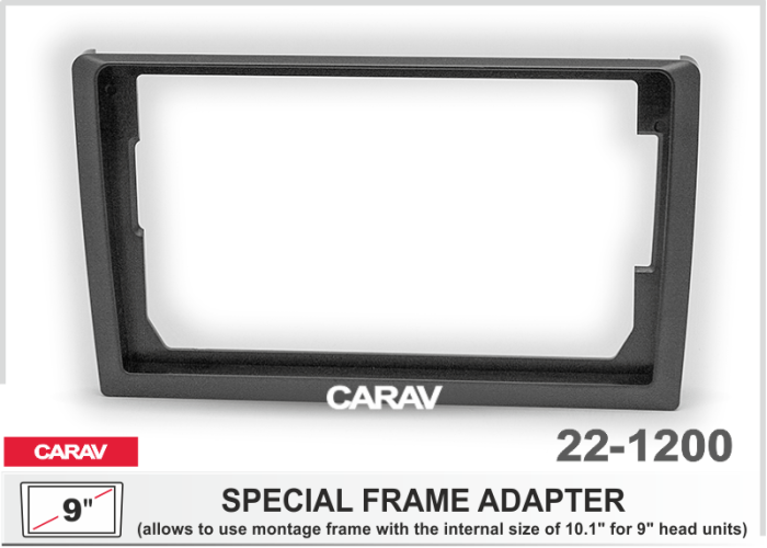 Переходная рамка Carav 22-1200 — универсальный адаптер для установки 9" магнитолы (230/220 x 130 мм) в штатные проемы под 10.1". Изготовлена из высококачественного ABS-пластика черного цвета с защитой от царапин, обеспечивает надежное крепление без зазоров.