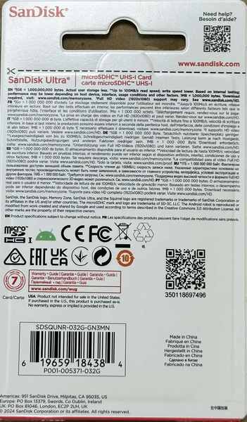 SanDisk Ultra MicroSDHC 32 ГБ 100Mb/s Class 10 UHS-I — карта памяти формата microSDHC объёмом 32 ГБ, класс скорости 10 и UHS-I U1, скорость чтения до 100 МБ/с, запись около 10 МБ/с. Подходит для видеорегистраторов, камер, смартфонов и других устройств с поддержкой microSDHC, оптимальна для записи Full HD видео.